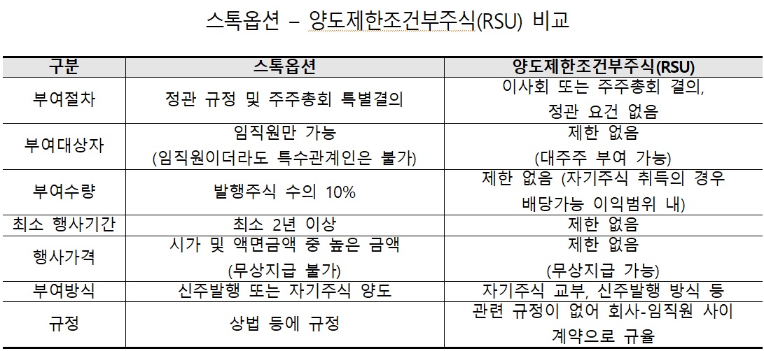 또한 발행 대상, 한도, 수량 등 규제가 있는 스톡옵션과는 달리 양도제한 조건부주식은 법적 규제가 전무하다.