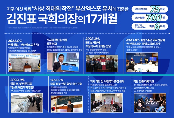 2002년 당시 청와대 정책기획 수석비서관으로서 한일 월드컵의 성공을 이끈 김 의장은 “부산엑스포는 88서울올림픽, 2002월드컵에 버금가는 국가 중흥의 도약대다”며 2022년 7월 취임 후 2023년 11월까지 지구 6바퀴에 이르는 약 24만km를 이동해 75개국 700여 명의 대통령, 국회의장, 총리, 장관, 대사 등을 만나 다수의 국가지도자로부터 긍정적인 답변을 이끌어 냈다.