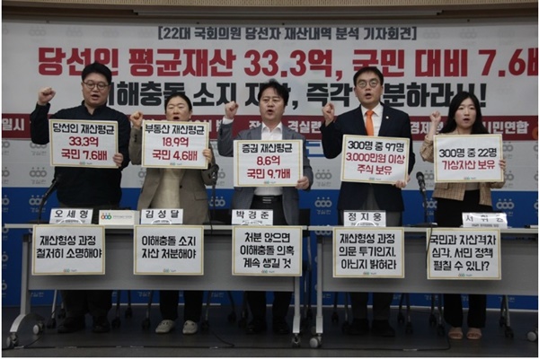(서울=NSP통신) 강은태 기자 = 경제정의실천시민연합(이하 경실련)은 21일 발표한 22대 총선 국회의원 당선자 평균 재산이 33.3억 원으로 일반 국민 평균 재산의 7.6배로 나타났다.