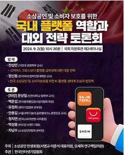 한편 ‘C커머스 대책’ 토론회에는 서영교, 오세희 국회의원 등 의원들과 전성민 가천대 경영학부 교수, 정신동 한국외대 법학전문대학교 교수, 유정희 벤처기업협회 본부장, 백운섭 한국플랫폼입점사업자협회 회장k 안용길 서울과학기술대 교수, 정지연 한국소비자연맹 사무총장, 박성용 바오담 브랜드 대표가 참석하며 주제 발제 후 민·관·학 전문가들의 토론과 플로어 질의응답이 예정돼 있다.