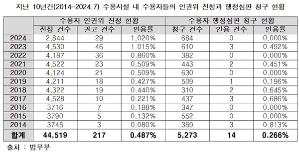 국회 운영위원회 소속 강명구 국민의힘 국회의원(경북 구미시을)이 법무부에서 제출받은 자료에 따르면 교도소 수용자(2014-2024.7)가 국가인권위원회에 제출한 진정서가 총 4만 4519건 이지만 이 중 217건만 인용되고 나머지는 모두 기각됐다.