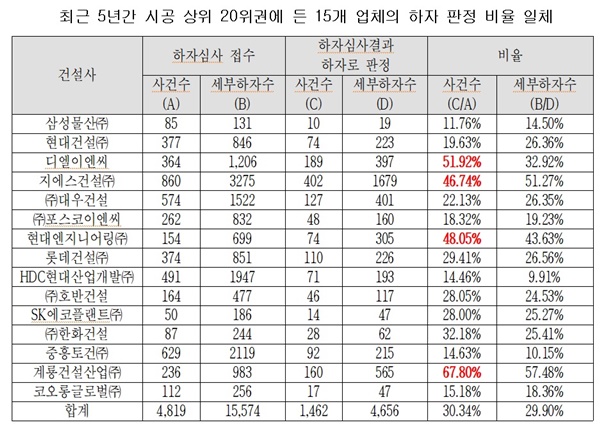 시공 능력 20위권 15개 건설사, 하자 판정 비율 30.34%