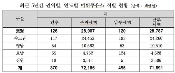 한편 탈루 세액이 권역을 높은 순서대로 살펴보면 ▲충청권이 126건, 약 289억 중 약 287억원을 회수하지 못해 가장 많은 것으로 나타났다. 이어 ▲수도권이 117건 245억 원 중 242억원 ▲영남권 54건 105억 원 중 105억 원 ▲호남권 55건 47억 원 중 46억 원이었다. 유류세가 지방세의 일정 부분을 차지하고 있다는 점을 감안 하면 건전한 지방재정 운용에도 적지 않은 영향을 끼칠 것으로 추정된다.