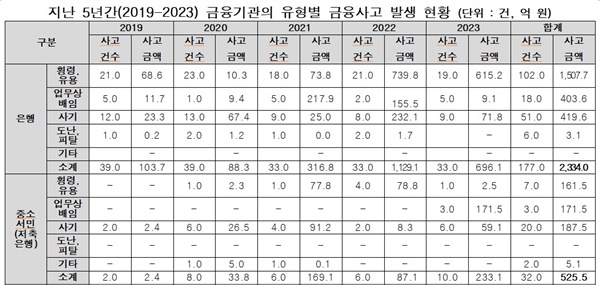 한편 금융기관 유형별 사고 내역을 살펴보면 금융투자기관(자산운용사, 신탁사 등)에서 7124억 원의 손실이 발생했다. 그중 대부분은 사기로 인한 것이었다. 은행에서는 내부 횡령 등으로 2334억 원의 손실이 발생했다. 이어 저축은행이 525억 원, 보험사가 461억 원, 신용정보사가 8.5억 원의 손실을 기록했다.