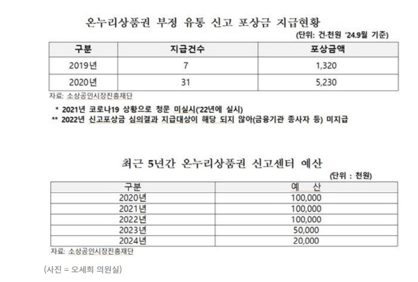 한편 오 의원실에 따르면 소상공인시장진흥공단 관계자는 “최근까지 온누리상품권의 사업과 사용 확대를 위한 방향으로 정책이 추진 되다 보니 단속 등 사후 관리에 부족한 부분이 있었다”며 “관련 신고를 했더라도 포상금 지급 대상이 되는지는 별도 건으로 묶어서 연말에 심의위원회를 개최할 예정이다”고 해명했다.