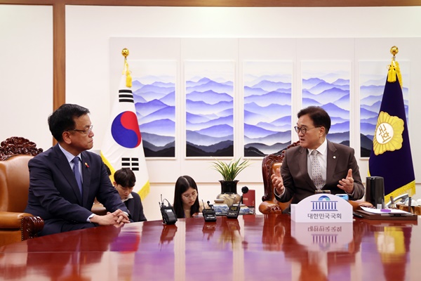 (서울=NSP통신) 강은태 기자 = 우원식 국회의장은 2일 오후 의장집무실에서 최상목 경제부총리 겸 기획재정부장관을 접견했다.