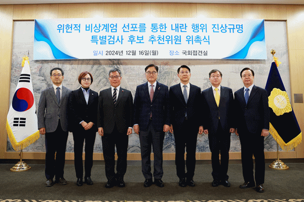 (서울=NSP통신) 강은태 기자 = 우원식 국회의장은 16일 오후 국회접견실에서 ‘위헌적 비상계엄 선포를 통한 내란 행위의 진상규명을 위한 특별검사 후보 추천위원 위촉식’을 개최하고 김석우 법무부 차관 등 7명의 위원을 위촉했다.
