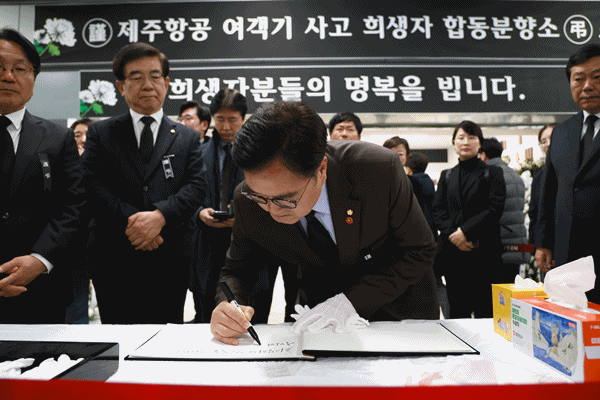 우 의장은 먼저 무안 공항 1층 분향소 조문록에 ‘희생자의 명복을 빕니다. 국민의 생명과 안전을 제일로 하는 나라를 꼭 만들겠습니다!’라고 글을 남겼다.