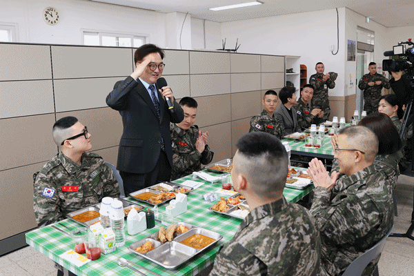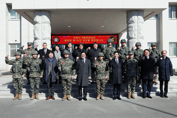 또 우 의장은 “병영식당 리모델링 등 병사들의 눈높이에 맞춘 복무환경 조성을 위해 국회도 세심히 살피고 챙겨나가겠다”며 “국가가 여러분들을 믿고 있다는 점을 가슴 속에 새기고 군 생활을 잘 해나가길 바란다”고 당부했다.
