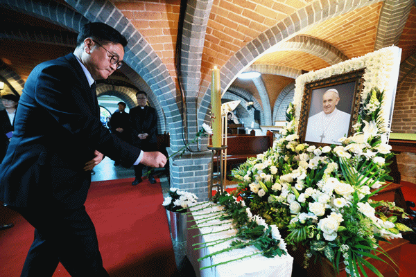 (서울=NSP통신) 강은태 기자 = 우원식 국회의장은 23일 오전 명동대성당을 찾아 지난 21일 선종한 프란치스코 교황의 추모 빈소를 조문했다.