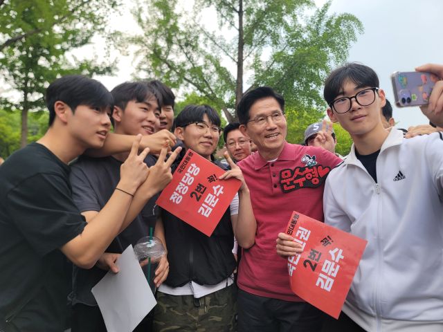 김 후보가 이동하는 길엔 영남대 학생들이 “문수형!”을 외치며 어깨동무를 하고 사진을 찍고 함께 춤을 추기도 했다.