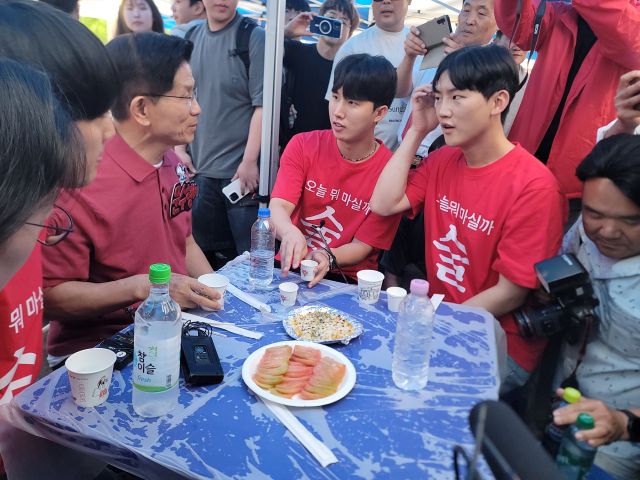 이어 한 주점에서 학생 3명과 합석한 김 후보는 종이컵에 물을 따라 건배를 했다. 김 후보는 학생들에게 “요즘 취업을 못해서 힘들지 않나”라고 물었고 학생들은 “아무래도 취업 때문에 고민”이라고 답했다.