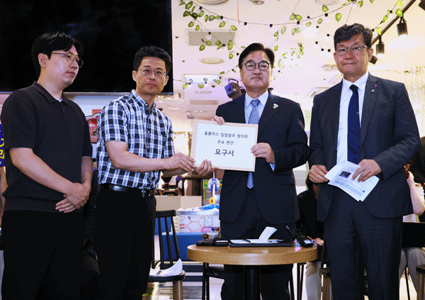 우 의장은 이어 “MBK는 아무런 대책도 없이 ‘기업 회생’이라는 말 한마디로 노동자와 입점점주들의 생존권을 위협하고 있다”며 “기업 회생 절차 이후에도 책임 있는 경영은커녕, 정산 지연, 자산 매각, 점포 철수 등을 통해 그 피해를 고스란히 입점점주와 노동자에게 전가하고 있다”고 말했다.