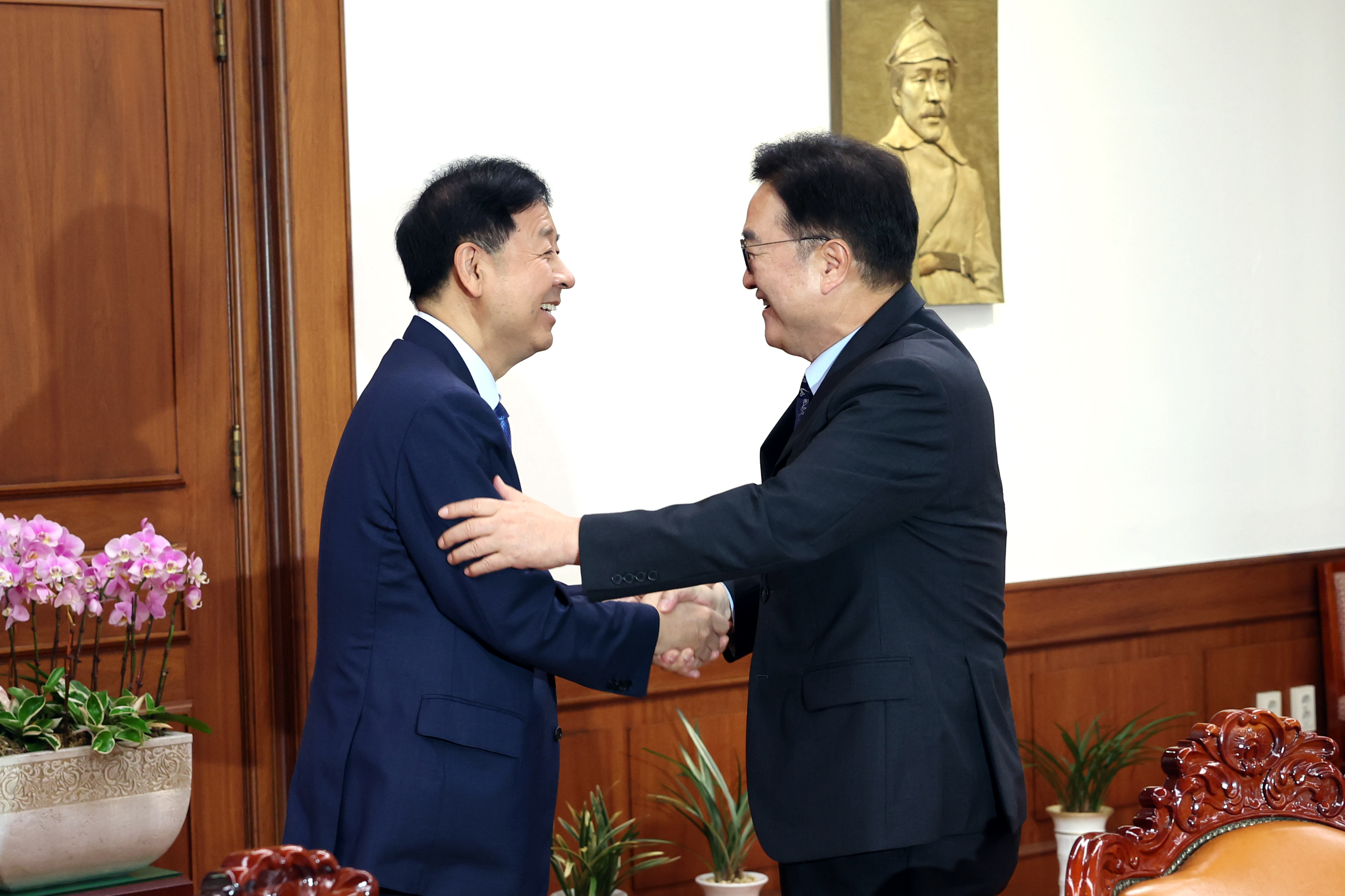 우원식 국회의장(우)이 구윤철 경제부총리 겸 기획재정부장관(좌)을 반갑게 맞이하고 있다. (사진 = 국회의장 공보수석실)