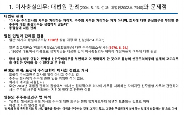 이어 “그런데 그건 보면 선관주의 의무와 충실 의무를 구별하지 않았기 때문에 법 판단을 그렇게 했기 때문에 나온 결과라고 생각된다”며 “사실 앞으로 소송이나 이런 과정 속에서 이런 판례들이 정립되는 게 필요하다고 본다”고 덧붙였다.