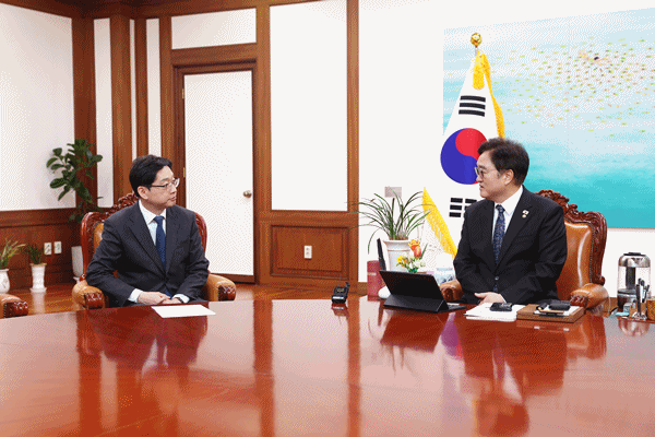 (서울=NSP통신) 강은태 기자 = 우원식 국회의장은 4일 오전 의장집무실에서 김경수 지방시대위원장을 접견했다.