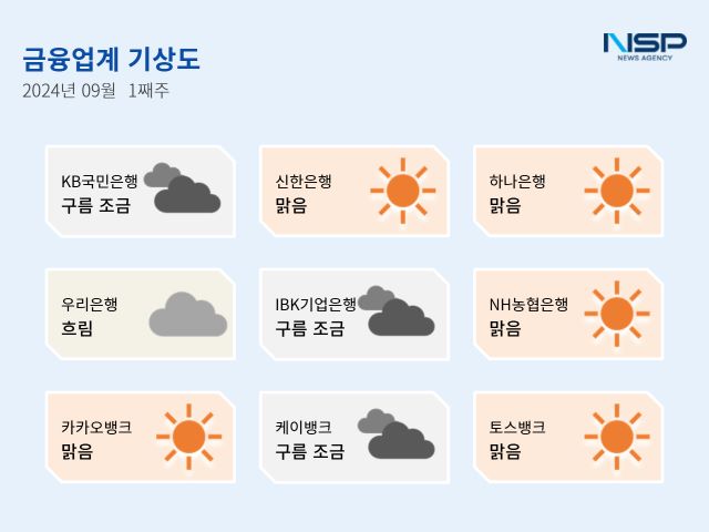 (서울=NSP통신) 강수인 기자 = 2024년 9월 1주차 금융업계기상도는 신한은행·하나은행·NH농협은행·카카오뱅크·토스뱅크의 ‘맑음’, KB국민은행·IBK기업은행·케이뱅크의 ‘구름조금’, 우리은행의 ‘흐림’으로 기록됐다.
