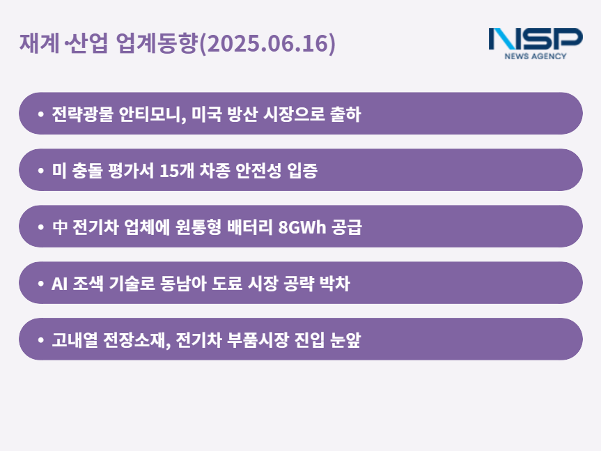 (서울=NSP통신) 최아랑 기자 = 방산·전기차·도료 등 주요 산업군에서 국내 기업들의 전략소재·배터리·AI 기술 기반 신사업 확장이 속도를 내고 있다. 글로벌 수요처 확보는 물론 현지 맞춤 기술을 앞세운 시장 진입이 잇따르며 공급망 전략 변화에 발 빠르게 대응하는 모습이다.