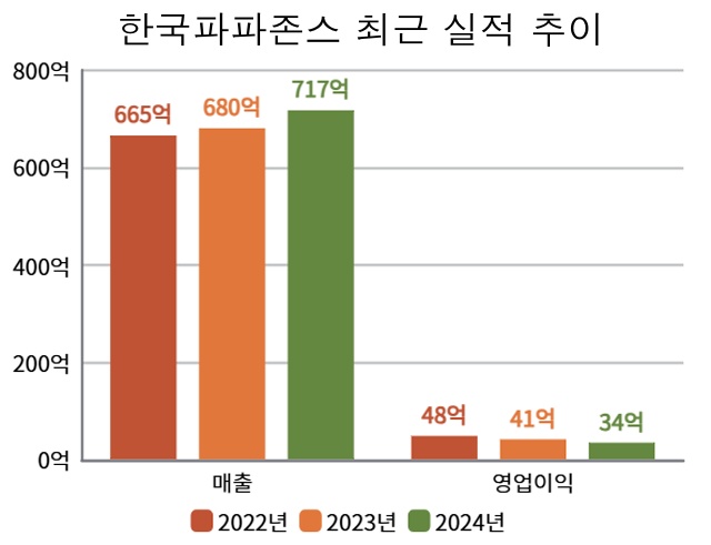 파파존스는 실적면에서 꾸준한 매출 증가세를 모여주고 있다. 발표된 실적에 따르면 지난 2022년 665억에서 2024년 717억으로 약 8% 상승했고, 점포 수도 같은 기간 비교해 239개에서 262개로 23개가 늘었다.