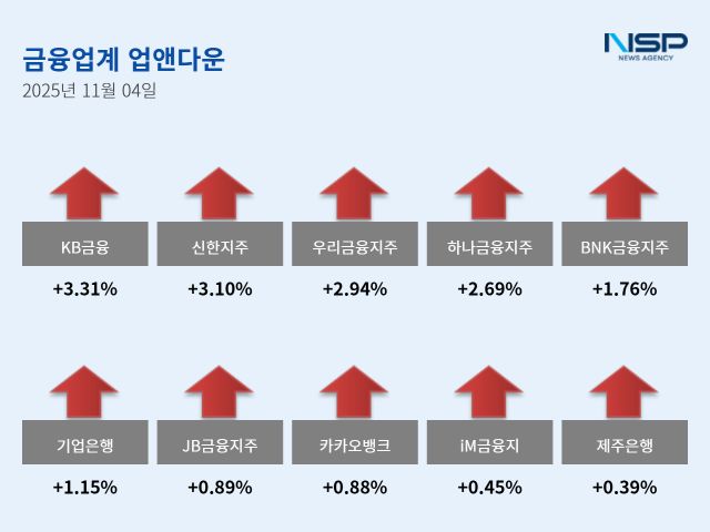 기업은행은 전거래일 대비 1.15%(220원) 상승해 1만9330원으로 장을 마감했고 JB금융지주는 전거래일 대비 0.89%(200원) 올라 2만2750원으로 장을 마쳤다.