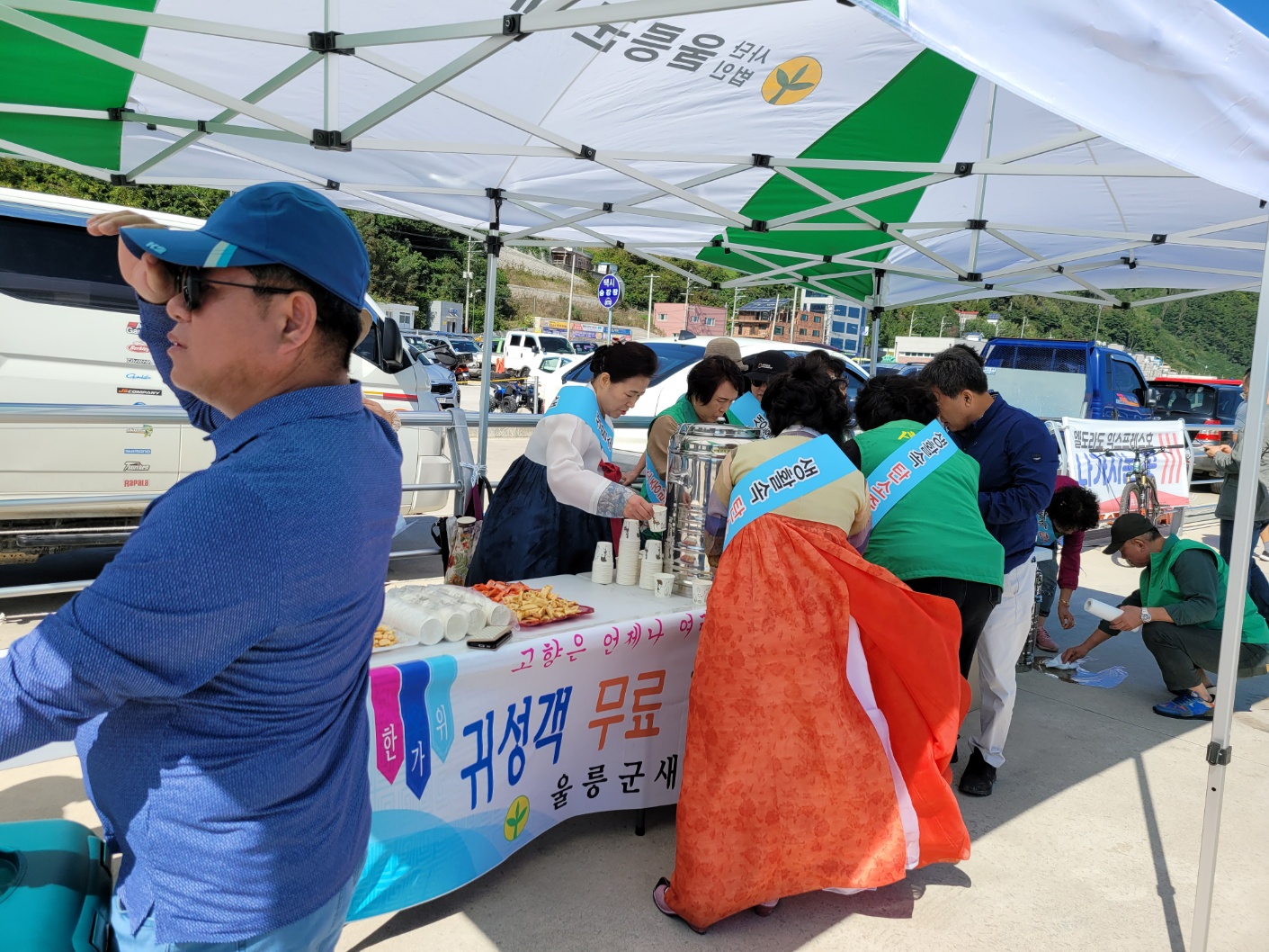 (경북=NSP통신) 최성만 기자 = 울릉군 새마을회와 울릉군 새마을부녀회는 지난2일 사동항 여객선 터미널에서 추석 명절을 보내고 울릉도를 떠나는 출향인들과 관광객들에게 향토차를 대접했다.