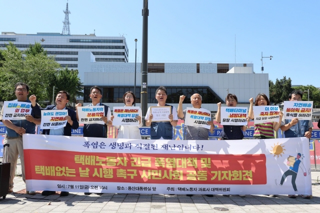 한편 지난 11일 오전 10시 용산 대통령실 앞에 모인 ‘택배노동자 과로사 대책위원회’는 폭염 대책과 택배 없는 날 시행에 대한 촉구 기자회견을 열었고 이에 CJ대한통운 측은 ▲혹서기 택배기사 자율적 작업중지권 부여 ▲배송지연에 대한 면책 ▲8월 14~15일은 ‘택배 없는 날’로 모든 택배기사 휴식 보장을 시행하기로 했다. 하지만 아직 택배노동자들은 주7일 배송에 문제 없이 휴무도 보장받을 수 있는 근본적인 해결책이 필요하다고 목소리를 높이고 있는 상황.