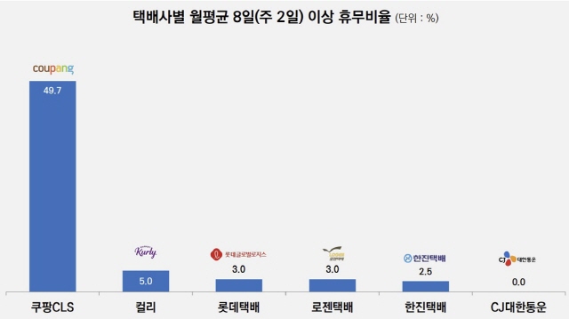 실제로 최근 한국물류과학기술학회에서 발표한 ‘택배기사 업무환경 및 만족도 조사’에 따르면 ‘택배사별 월평균 8일(주 2일) 이상 휴무비율’은 쿠팡이 46.7%로 압도적인 1위를 기록했고 CJ대한통운은 0.0%로 꼴찌를 기록했다. ‘주 5일 이하 업무비율’에서도 쿠팡이 62%로 1위, CJ대한통운이 1.5% 뒤에서 두 번째 순위를 차지했다. 이 외에 ‘3일이상(영업일 기준) 연속휴무 사용경험’ 비율에서도 쿠팡이 49.0%로 압도적인 1위·CJ대한통운은 19%로 3위를 기록하기도 했다.