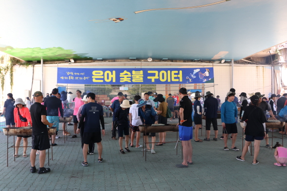 NSP통신-봉화 은어축제기간 내성대교 아래에 마련된 숯불 은어구이 체험장은 관광객이 직접 석쇠 한 판을 구입해 은어를 구워서 먹을수 있어 은어잡이 체험객들의 발길이 이어졌다. (사진 = 김오현 기자)
