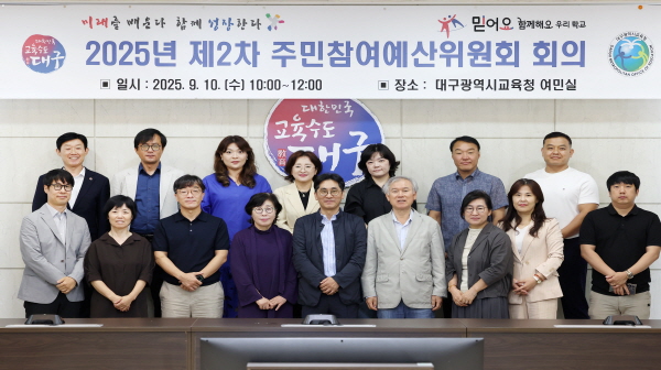 (경북=NSP통신) 김대원 기자 = 대구시교육청은 2025년도 주민과 학생의 예산 제안을 심의하기 위해 10일 시교육청 여민실에서 ‘제2차 주민참여예산위원회’를 개최했다.