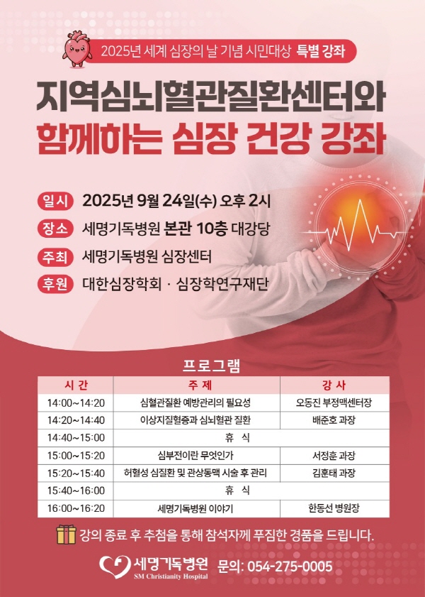 포항세명기독병원은 오는 24일 오후 2시 본관 10층 대강당에서 세계심장연맹(WHF)이 지정한 ‘세계 심장의 날(9월 29일)’을 기념해 ‘지역심뇌혈관질환센터와 함께하는 심장 건강 강좌’를 개최한다. (사진 = 포항세명기독병원)