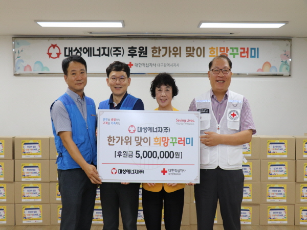 한편 대성에너지는 2009년부터 대한적십자사 대구지사와 사회공헌 협약을 맺고 저소득 청소년 매칭그랜트 후원, 행복한 밥상 무료급식, 사랑의 삼계탕 나눔 등 다양한 사회공헌 활동을 지속해오고 있으며 앞으로도 ESG경영 실천을 통해 따뜻한 지역사회 조성에 앞장설 계획이다.