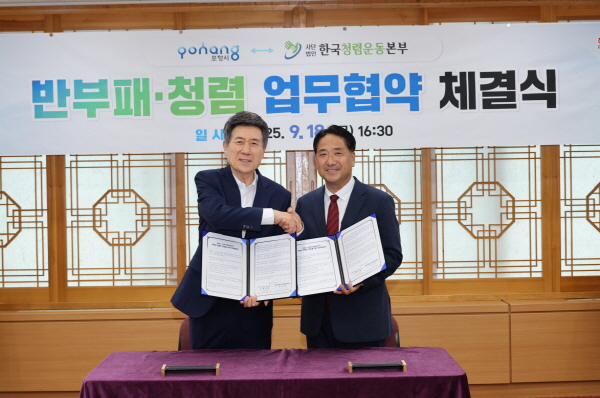 포항시는 18일 시청 대외협력실에서 한국청렴운동본부와 부패취약분야 개선 및 청렴시책 추진의 전문성 강화를 위한 업무협약을 체결했다고 밝혔다. (사진 = 포항시)