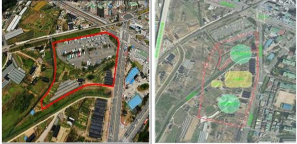 NSP통신-고양시 주교동 신청사 기존부지(좌)와 변경된 부지(우), 기존 4만126㎡(사유지 6369㎡+국공유지 3만 3757㎡)가 7만 3096㎡(사유지 5만2,888.95㎡+국공유지 2만 207.05㎡)로 부당·위법하게 변경돼 사유지가 기존 6369㎡에서 5만2888.95㎡으로 큰 폭으로 증가됐다. (사진 = 제보자)