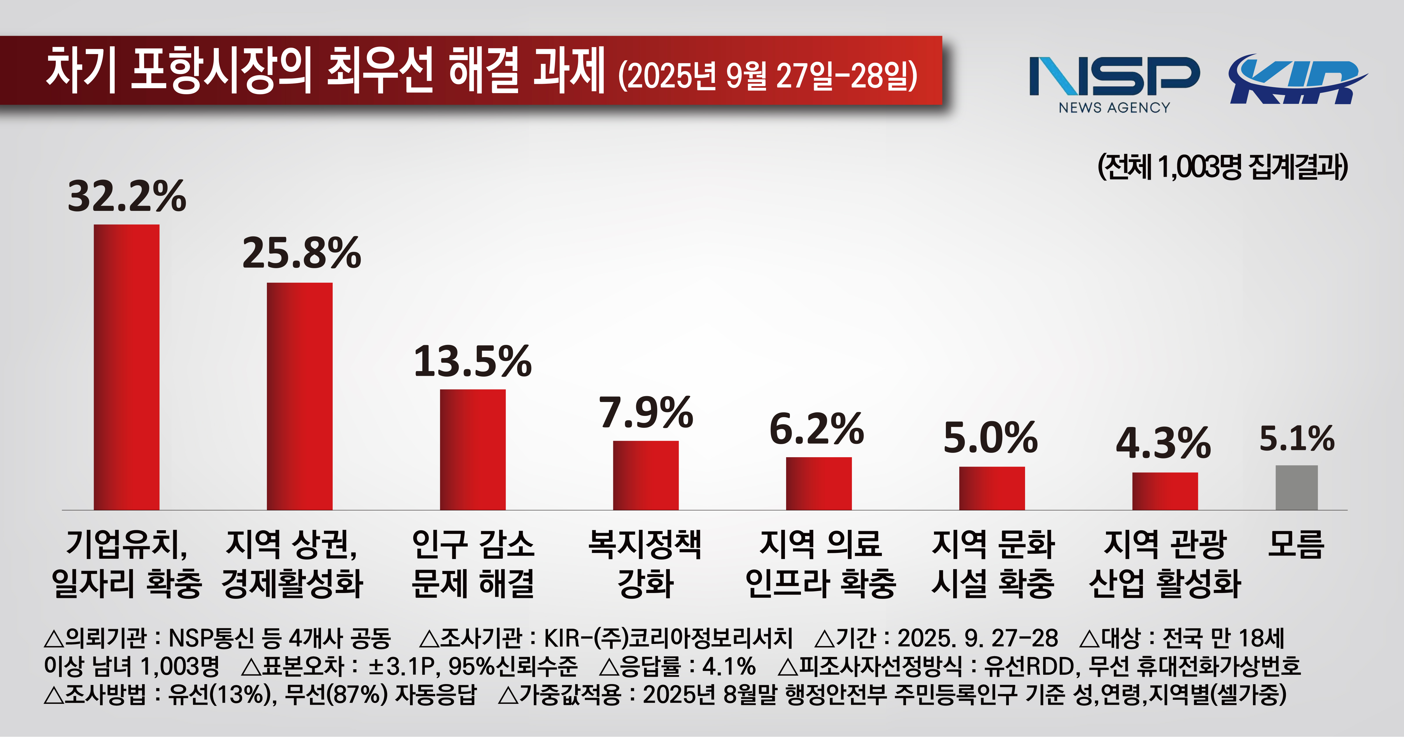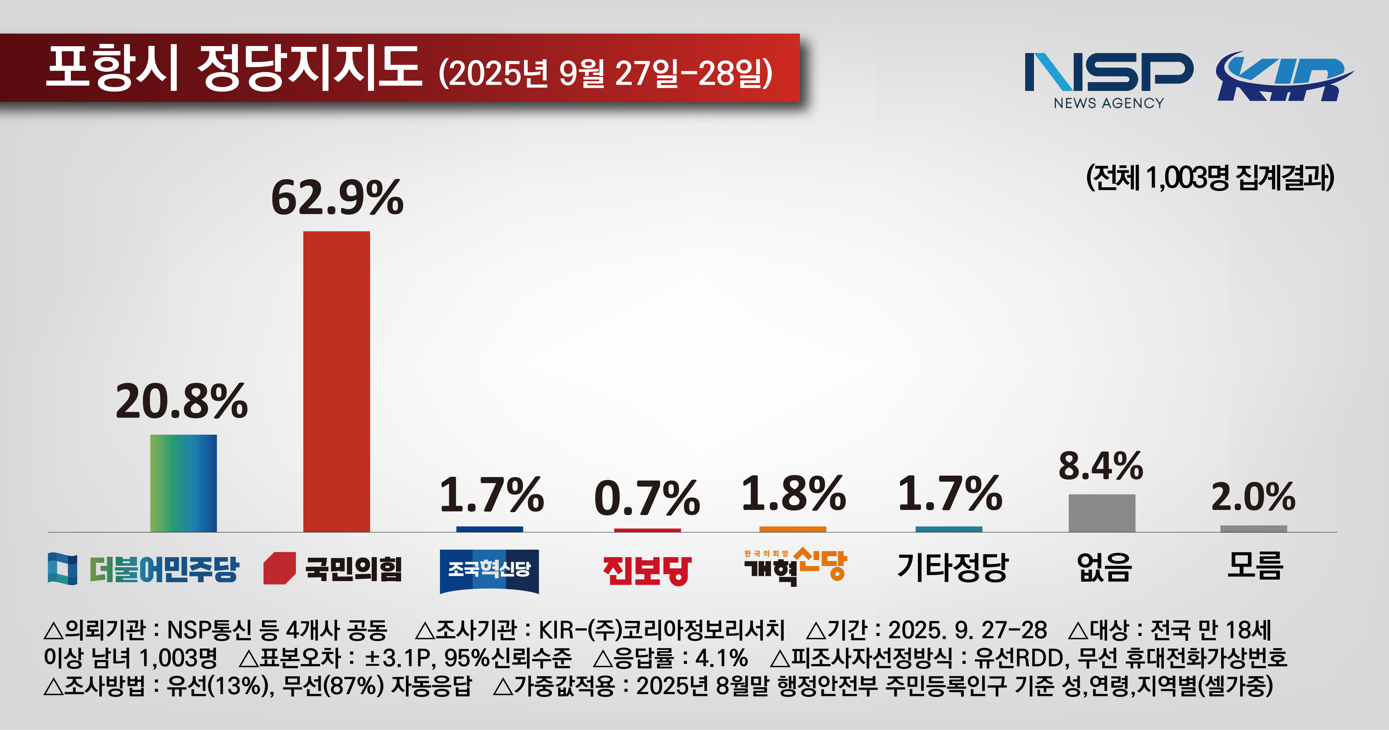이번 조사는 지난 9월27일, 28일 2일간 포항시 거주 만 18세 이상 남녀 1003명을 대상으로, 무선전화 가상번호(87%)와 유선전화 RDD(13%)를 이용하여 자동응답 방식으로 진행됐다. 응답률은 4.1%(무선전화 6.6%, 유선전화 1.2%)이고, 표본오차는 95%의 신뢰수준에 ±3.1%p다. 통계보정은 2025년 8월 말 행정안전부 발표 주민등록 인구 기준 성, 연령, 지역별 셀가중값을 부여했다.
