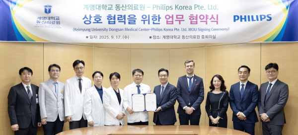 지난 17일 협약식에는 조치흠 계명대 동산의료원장, 권상훈 대외협력처장, 박기범 수술센터장, 송봉일 스마트혁신부실장을 비롯한 의료원 관계자들과 최낙훈 필립스 코리아 대표, 빅터 스툴렌 필립스 엔터프라이즈 인포메틱스 아세안 및 한국 세일즈 총괄, 공순성 필립스 코리아 세일즈본부장 등이 참석했다.