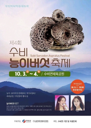 (경북=NSP통신) 조인호 기자 = 영양군은 오는 3일부터 4일까지 2일간 수비면 체육공원 일원에서 ‘제4회 수비 능이버섯축제’를 개최한다고 밝혔다.
