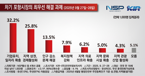 NSP통신대구경북취재본부, 딜사이트경제TV 대구경북취재본부, 아이뉴스24 대구경북취재본부, 경북브리핑뉴스 공동으로 코리아정보리서에 의뢰해 지난 9월27일, 28일 2일간 실시한 차기 포항시장의 최우선 해결과제 조사 결과, 기업유치·일자리 확충 32.2%, 지역상권·경제활성화 25.8%로 경제 해결이 58.0%에 달해 현재의 포항경제 상황이 잘 반영됐다는 분석이다.