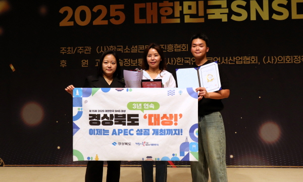 (경북=NSP통신) 조인호 기자 = 경상북도가 ‘제15회 2025 대한민국 SNS 대상’ 광역자치단체 부문 대상을 받으며 3년 연속 대한민국 최고의 SNS 소통 지자체로 자리매김했다.