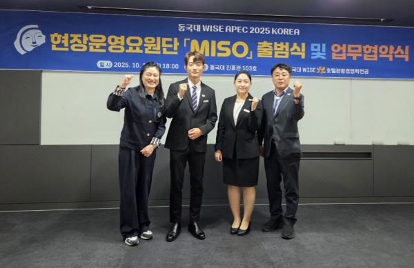 (경북=NSP통신) 조인호 기자 = 동국대 WISE캠퍼스 호텔관광경영학과가 지난 16일 교내 진흥관 103강의실에서 APEC 2025 KOREA 기간에 배치될 호텔관광 전문 교육을 받은 현장운영요원단 ‘MISO’ 출범식과 함께 관련 기관 및 기업들과 업무 협약식을 가졌다고 밝혔다.