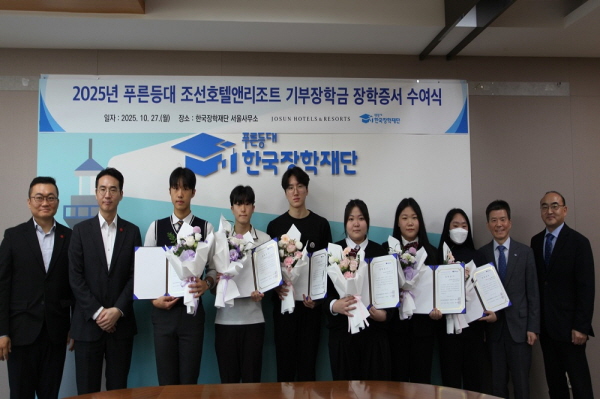 (경북=NSP통신) 김대원 기자 = 한국장학재단(이사장 배병일)과 조선호텔앤리조트(대표이사 최훈학)는 지난 27일 한국장학재단 서울사무소에서 2025년 푸른등대 조선호텔앤리조트 기부장학금 장학증서 수여식을 개최했다.