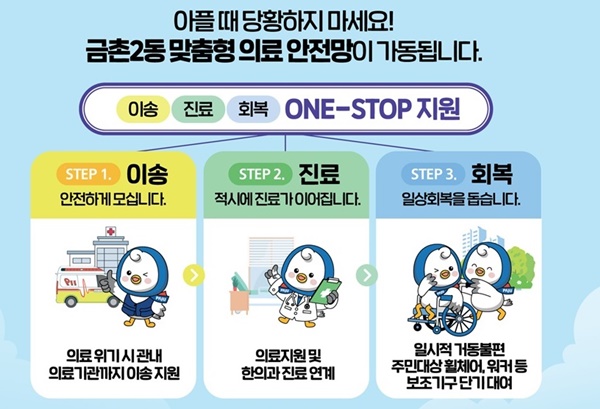 강영도 금촌2동 동장은 “통합돌봄 이음 서비스는 이동 수단이 없거나 보호자가 없어 적기에 병원을 방문하지 못하는 주민들을 위한 긴급 의료 이송 서비스다”며 “응급상황 발생 시 주민의 생명을 구하고 수술이나 사고 후 퇴원한 주민이 일상으로 정상 복귀할 때까지 돌봄이 끊기지 않도록 지원하는 사회복지 제도다”고 말했다.
