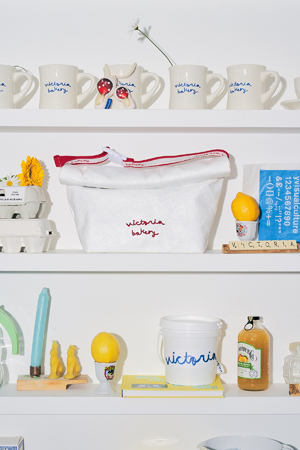 또 빅토리아 베이커리의 대표 디저트인 컵케익을 모티브로 제작된 미니 크로스백, 똑딱이와 지퍼 여밈 장식으로 앞치마 겸 숄더백으로도 연출 가능한 상품도 출시된다.