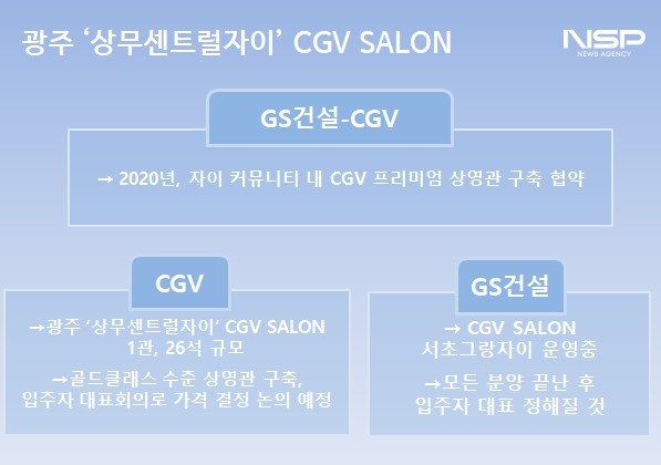 (서울=NSP통신) 정의윤 기자 = GS건설이 이달 분양예정인 광주 ‘상무센트럴자이’에 입주민만의 특별한 영화관인 CGV 살롱(CGV SALON)이 마련되는 가운데 커뮤니티시설에 기대감이 높아지고 있다. 이에 대해 CGV관계자에게 광주 상무센트럴자이의 CGV 살롱(CGV SALON)에 대해 들어보니 “골드 클래스 수준에 가격은 낮게 맞춰 분양 후 입주민 대표 회의에서 결정할 것”이라고 말했다.