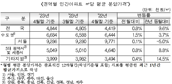 15일 주택도시보증공사(HUG)는 2023년 4월말 기준 ‘민간아파트 분양가격 동향’에 따르면 전국 민간아파트 최근 1년간 ㎡당 평균 분양가격(공급면적 기준, 이하 ㎡당 평균 분양가격*)은 484만 4000원으로 전월 대비 0.81% 상승했다고 밝혔다.