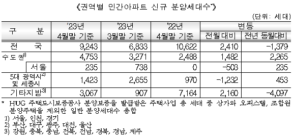 또 2023년 4월 수도권 신규 분양가구수는 총 4753가구, 5대 광역시와 세종시는 총 1423가구, 기타지방은 3067가구가 신규 분양됐다.