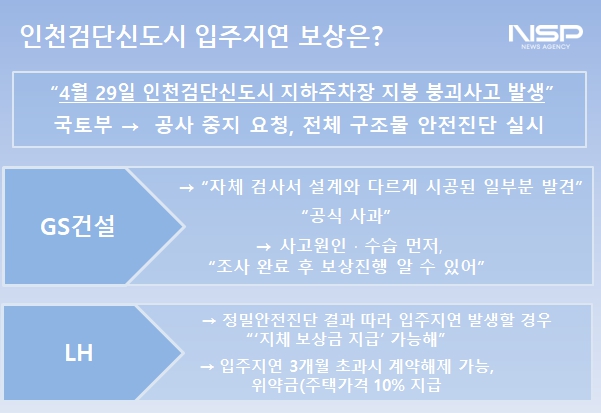 (서울=NSP통신) 정의윤 기자 = 지난달 29일 인천 검단신도시 신축 건설현장 붕괴사고와 관련해 GS건설은 설계와 다르게 시공됐다고 공식 사과한 가운데 사고원인 조사로 입주지연이 불가피한 상황이다. 이에 발주처인 LH와 시공사 주관사인 GS건설에 입주지연 보상에 대해 들어보니 “입주지연이 불가피할 시 지체보상금을 지급한다”고 밝혔다.