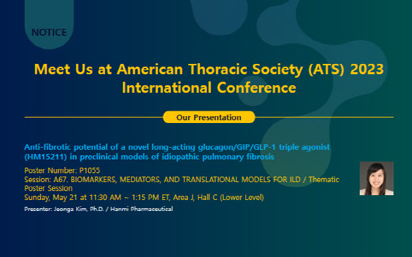 발표 내용은 랩스 트리플 아고니스트(LAPSTriple agonist)가 특발성 폐섬유증(IPF) 치료제로도 개발될 수 있는 가능성을 확인한 연구 결과다.