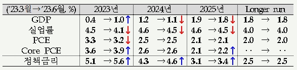 경제전망에서는 최근의 경제지표 호조를 반영해 연내 GDP 성장률(0.4% → 1.0%) 및 근원 인플레이션(3.6% → 3.9%)은 상향, 실업률(4.5% → 4.1%)은 하향 조정했으며 이에 따라 점도표에서는 올해 최종금리 전망을 예상보다 큰 폭(50bp, 2회 인상폭)으로 상향 조정했다.