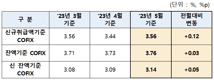 잔액기준 코픽스는 3.76%로 전월 대비 0.03%p 상승했으며 신잔액기준 코픽스는 3.14%로 전월 대비 0.05%p 상승했다.
