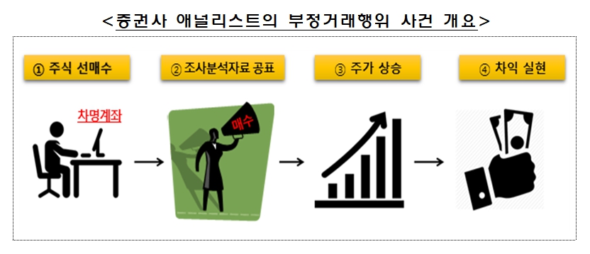 금감원에 따르면 그는 ‘매수의견’이 담긴 자신의 조사분석자료를 공표하기 전 차명 증권계좌를 이용해 해당 주식(22개 종목)을 매수했다가 자료 공표 후 주식을 매도하는 방법으로 약 5억 2000만원의 부당득을 취득한 것으로 확인됐다. 이는 자본시장법 제178조를 위반한 행위다.